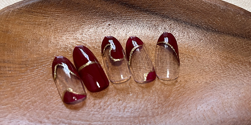 深みのあるボルドーに、ゴールドラインを効かせた大人のネイルデザイン。 透明感を活かした抜け感のある仕上がりで、指先をエレガントに引き立てます。