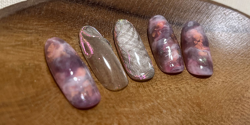 繊細なマーブル模様と艶のある質感が、指先を女性らしく美しく彩ります。 オフィスシーンにも馴染む落ち着いた雰囲気ながら、さりげない華やかさを演出。 横浜・馬車道・関内のネイルサロンをお探しの方にぴったり